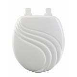 Easy Clean & Change hinge allows for removal of seat for easy cleaning and replacementSTA-TITE Seat Fastening System never loosens and installs with easeDurable molded wood with a high-gloss finish that resists chipping and scratchingExclusive Sculptured swirl desgin to complement your bathroom décorFits all manufacturers' round bowls in the US and CanadaMade in the USA with environmentally friendly materials and processes