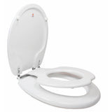 • Parents and children love this convenient, innovatively designed toilet seat created for enhancing the potty training experience of your child. A magnetic closure gently secures the built-in potty seat into its compartment in the seat lid until it is flipped down for use. The hinges are state-of-the-art slow close chromed metal. The hinges close the lid and ring quietly and gently. The lid and the ring are both white. This particular model fits round bowls which measure 16. 5 inches from hinge holes to end of the inside of bowl. Installation hardware included. See diagrams above. Three-year warranty.