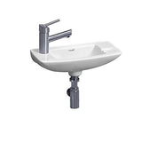 Whitehaus Collection Isabella small wall mount basin with center drain and left hole drill. Available in white only. Sink does not have an overflow.