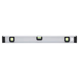 • 18" top reading aluminum level with rule, 3 vial, Mid size extruded aluminum frame with clear silver anodized finish & top reading level vial window, ruled edge in 1/8ths, 1/16ths & cm, 360 degree reading acrylic yellow barrel vials, shock protecting end caps, frame dimensions: 1" x 2-1/8".