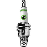 Near elimination of performance inhibiting carbon deposits, dramatically longer plug life and limited warrantyDiamondFire electrode technology that creates a superior spark and resulting flame front extending further into the cylinder, producing more localized pressureSignificant potential power increase: > 6% to 12% (depending on engine class)Significant potential fuel efficiency improvement: > 4% to 13% (depending on engine class)Drastic potential emissions reduction when used in 2 and 4-stroke engines (after 50 hours): 58% CO emissions reduction, 42% hydrocarbon reductionE3 has taken the best features from traditional spark plugs, such as cut-back ground electrodes and surface gaps, and combined them to create a new ground electrode design. Surface gap plugs present the flame kernel to the piston (or rotor) more directly, reducing the travel time from the spark to the combustion gases (although this difference is only measurable in hundred-thousands of a second, at 5000 RPM, they can add up). This avoids the "doughnut" shaped flame front created by standard spark plug electrodes. This is achieved in the E3 design through the open section at the top of the ground electrode. E3 spark plugs combine the benefits of additional sharp electrode edges with a cut-back electrode design used on some racing spark plugs. The increase of available edge-to-edge surface area encourages a more rapid spark discharge while also reducing quenching and shadowing. The two legs that support the special geometryof E3's powersports plug ground electrode aid in heat dissipation for longer electrode life. The center electrode on E3 spark plugs is created from nickel alloy with a copper center core for both improved conductivity as well as heat dissipation.
