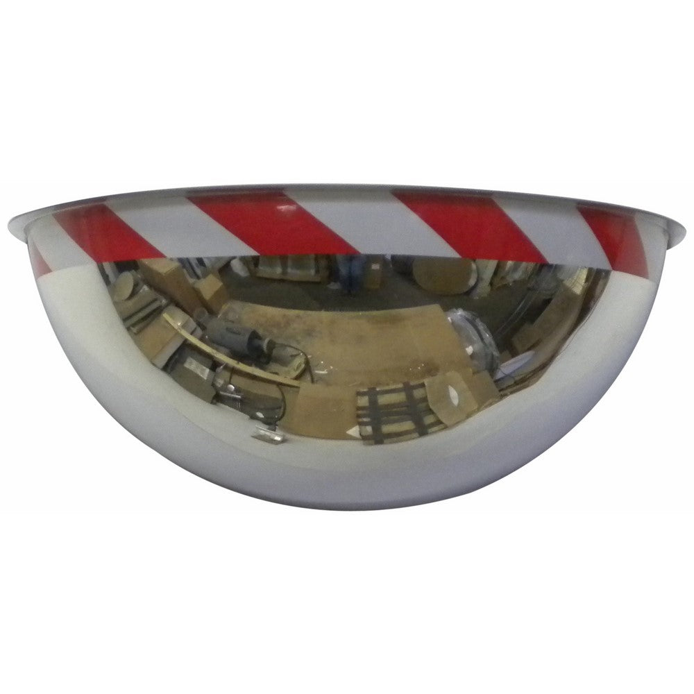 The See All PV18-180RT Panaramic half dome Plexiglas security mirror is an acrylic dome mirror with an 18" diameter and a high-visibility rim, that mounts on a wall and reflects a 180 degree angle image for an overhead view of 3-way intersections, and helps a person see around obstacles for safety, or monitor a wide area for efficient surveillance. Acrylic is shatter resistant, weighs less than glass, and reflects a clear, bright image. The mirror has a red and white diagonally striped, 3/4" vinyl edge for high visibility, and comes with wall-mounting hardware for convenient installation. The 18" diameter size is suitable for areas up to 150 sq. ft. (diameter is measured from the outside of the 3/4" rim).