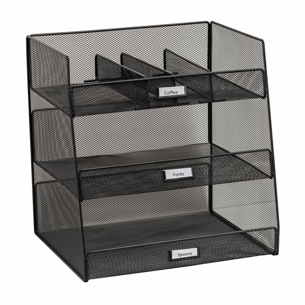Onyx steel mesh tower break room supply organizerThree large compartments with dividersTwo integrated metal wire handles for easy transportMetal label holders, labels includedSteel mesh construction with durable powder coat finishAdd the Onyx Break Room Organizer to your space for easy storage and organization. The unique metal mesh design allows for easy visibility of contents and fits into any workspace setting, from the break room to conference area. Organizer features three large compartments with removable/adjustable dividers for compartment size options and metal label holders (labels included) for simple organization and identification. The organizer is great for storing and organizing single serve coffee pods, napkins, small plates and bowls, silverware and much more. With ample storage space for supplies and essentials, the Onyx Break Room Organizer is the perfect break room solution.