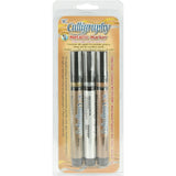 Metallic calligraphy markers calligraphy markers contain a generous ink supply for multiple projectsSharp durable nibs for excellent results are odor free, contain no xylene, have water-based pigment and are non-toxicFor elegant writing on invitations, announcements, greeting cards, signs, awards and certificates on light or dark paper also writes on most glossy papersInk is water resistant when dry and conforms to ASTM D4236This package contains three markers with silver, gold and copper colorMetallic calligraphy markers calligraphy markers contain a generous ink supply for multiple projects and feature sharp durable nibs for excellent results are odor free, contain no xylene, have water-based pigment and are non-toxic. for elegant writing on invitations, announcements, greeting cards, signs, awards and certificates on light or dark paper also writes on most glossy papers. Ink is water resistant when dry and conforms to ASTM D4236. This package contains three markers with silver, gold and copper color.