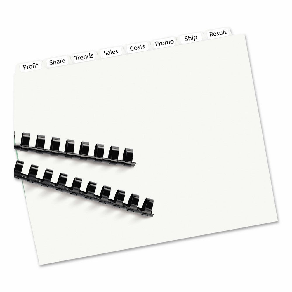 Choose unpunched tab dividers to create professional-looking customized bound documents right at your desktop.Great for use with comb or wire binding systems.Clear labels virtually disappear when applied to tabs.Save time by labeling all tabs at once using Easy ApplyTM label strip.For laser and inkjet printers.