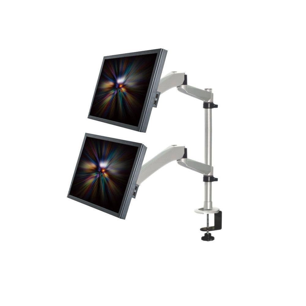 Clamp table thickness: 0.79"-5" (20-127mm); 10.6" Height adjustment. Supports two LCD monitorsPole length: 11.8" (300mm). Monitors can be placed next to each other or one on top of the other.Quick mount & quick release designs at 3 connecting points: stand, spring arm and monitor end.Supports up to 2 x 27" LCD monitors. Hole Diameter: 0.39"-1.97" (10-50mm).Supports two LCD monitors. Swift and easy movements and adjustments.