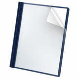 Oxford Premium Clear Front Report Covers are ideal for project presentation. The clear front cover showcases your title page and the coated, embossed back cover keeps everything together and polished. Concealed metal fasteners hold up to 100 letter-sized sheets—just 3-hole punch and present! Dark blue. 25 per pack.