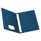 Oxford Twin Pocket Folders store up to 135 sheets of letter-sized paper. The built-in, 2-prong metal fasteners prevent important papers from falling out. Textured blue covers. Die-cut business card holder on inside pocket. Paper made from 10% recycled fiber with 10% post consumer fiber. Letter size. 25 per box.