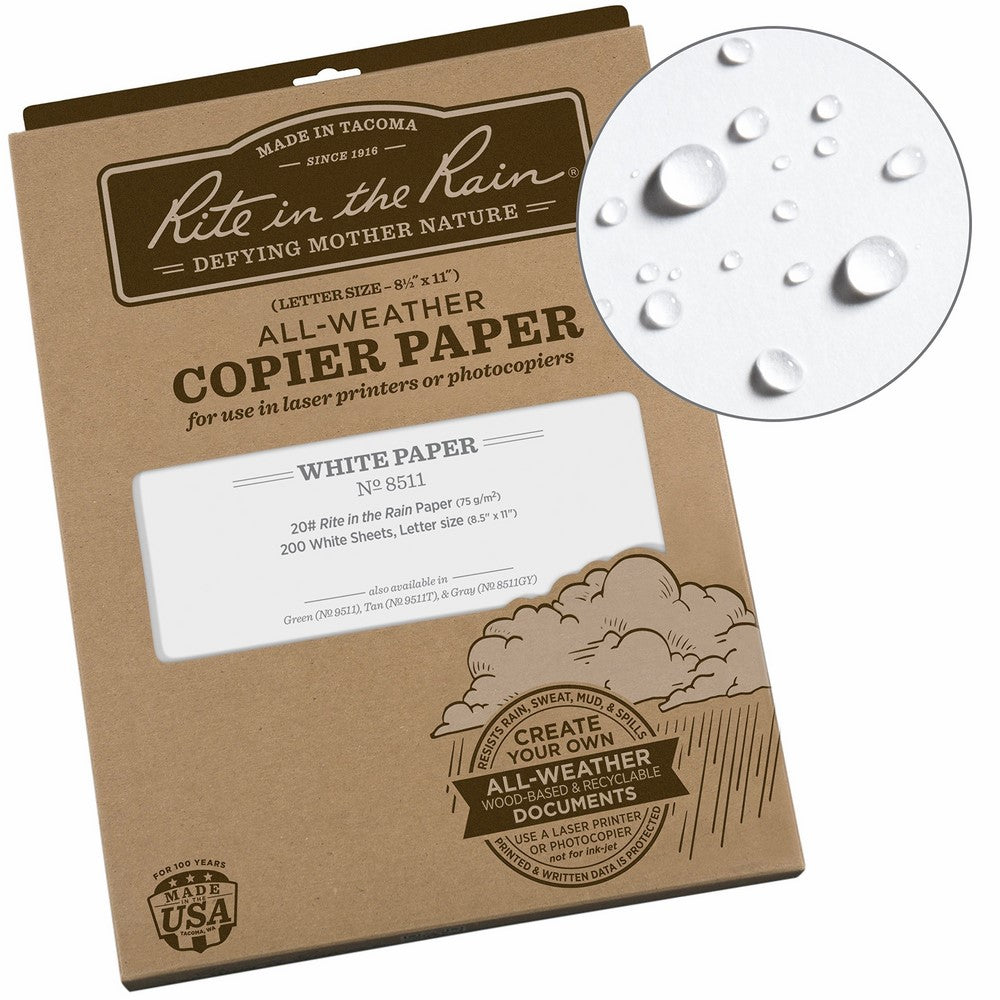 Copy or laser print your own all-weather forms, charts, maps, and worksheets on patented 8 1/2" x 11" Rite in the Rain all weather copier paper. Now you can have the convenience of using your existing data sheets on a paper that can survive in any weather condition. For just pennies a sheet, Rite in the Rain enables you to work efficiently, regardless of the environment. Paper is 20# bond weight. Completely recyclable wood-based paper! copy or laser print both sides! not for ink-jet printers.