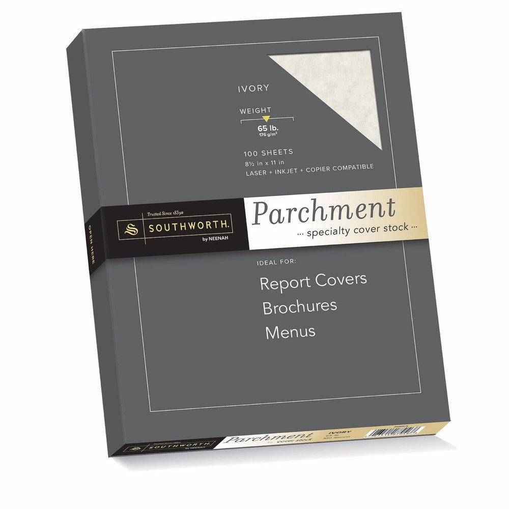 • Southworth Parchment Specialty Cardstock, in ivory, continues the proud tradition of old-world scroll paper. For certificates, awards, announcements, menus, invitations, presentations and more, parchment stationery conveys distinctive elegance, while it's modern printer compatibility ensures that all of your documents look refined and professional. This heavy-weight 65 lb. textured paper is free of acid and lignin, so your documents can stand the test of time and stand out with the distinguished, distinctive look of parchment.