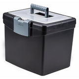 The Portable File Box from Storex features an extra large storage lid for all of your supplies. The clamping latch shuts lid safely and secures contents. This file box accommodates letter sized hanging file folders and is constructed of impact resistant plastic. Black. 10.88 x 13.25 x 11 inches. Storex products are built to function and are designed to impress.