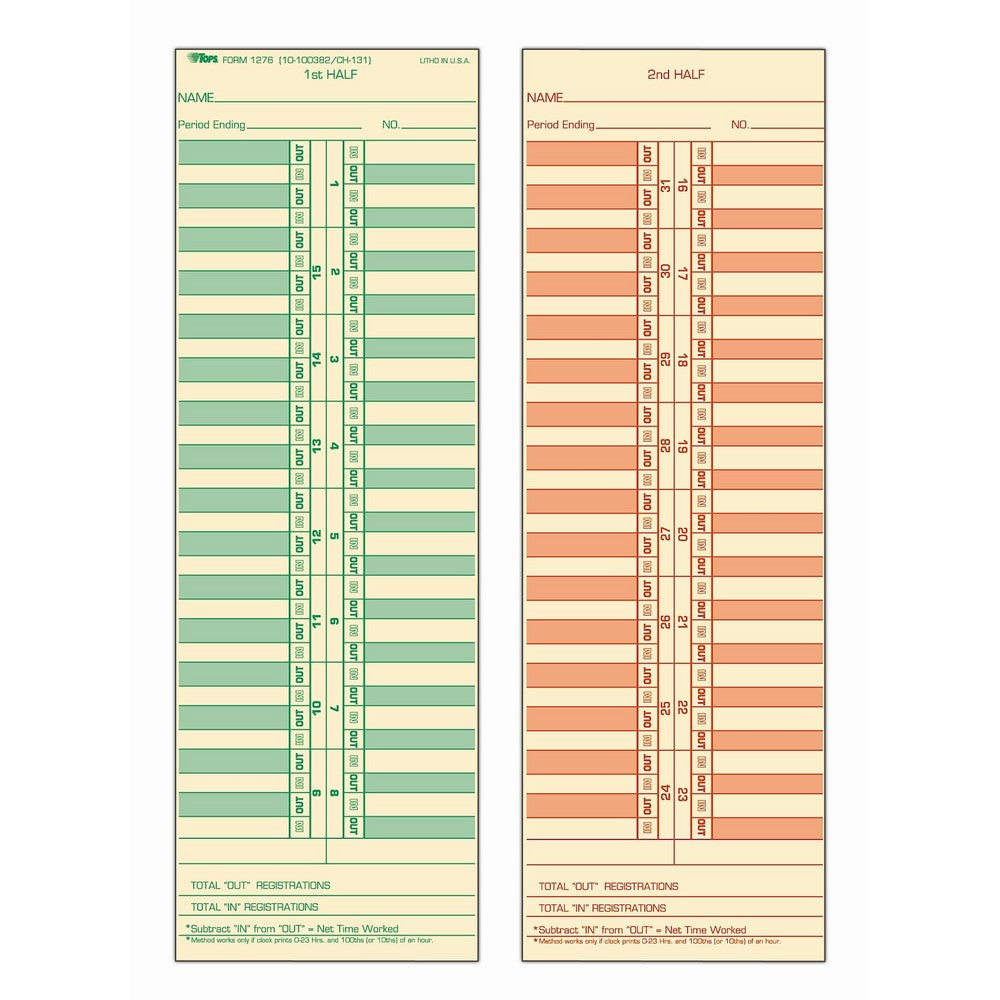 Since 1952, TOPS has provided quality products and services to businesses throughout the world. TOPS continues that commitment providing innovative, high quality value-added products for the office, school and home. TOPS Semi-Monthly Time Cards are made with sturdy heavyweight 143 lb. manila stock. With screened in and out boxes for a quick check of hours worked, total out and in registration lines to give a net time worked, these cards have fronts printed in green ink while backs are printed in red ink. Measuring 3.5 x 10.5 inches, the TOPS Semi-Monthly Time Cards are available 500 cards per box. These professional-looking time cards replace card numbers L34B, 10-100372 , and CH131. Time Clock Compatibility: 125R, 150R, 1000, 10000, 2100/4000, KCF, KCG, JCG, JCP, 2500(r). Whether it's notebooks, writing pads, record books, time cards, or any of the hundreds of items we offer, you can count on TOPS products to help.