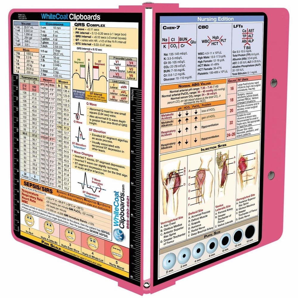 Full size nursing pocket clipboard from WhiteCoat Clipboards. Unique design allows the clipboard to fold in half for storage in your pocket. Made of lightweight aluminum with the ability to carry 15 pieces of paper without a crease, while at the same time securing all your medical information inside. Carry extra history and physical exam forms, SOAP notes or progress note pages without worry of losing your data. The clipboard also functions as a quick nursing reference with detailed day-to-day information such as basic laboratory values, acid base determination, injection sites, pain scale, and much more. BEWARE OF COUNTERFEIT SELLERS. MDpocket -WhiteCoat Clipboard is the manufacturer of this product.
