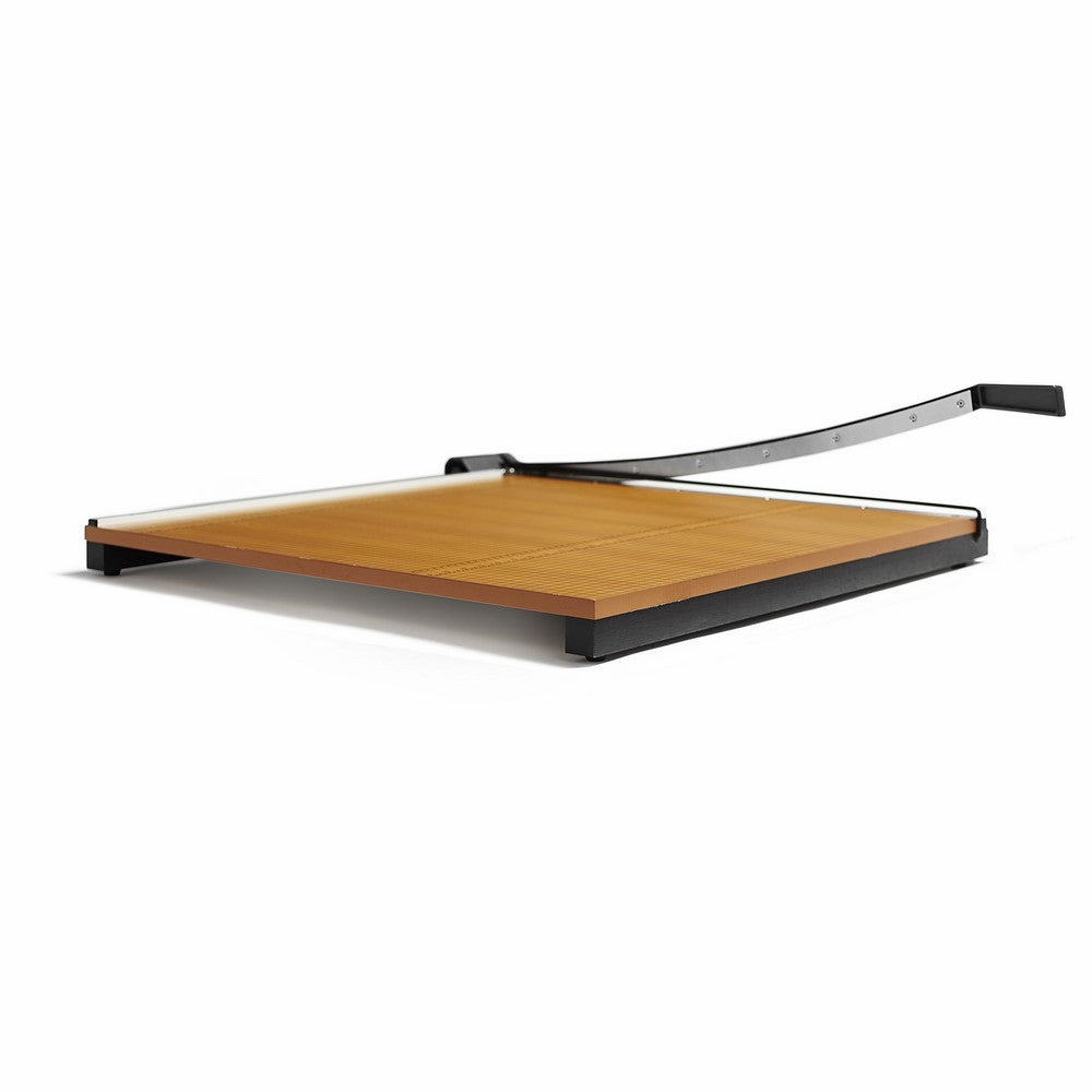 Accurate and efficient, the X-ACTO Commercial Grade Guillotine Trimmer cuts high volumes of paper with ease. With the ability to cut up to 20 pages at once, this trimmer creates quick and accurate cuts to paper of all sizes. Designed for school and office settings, this trimmer features a solid wood base for steady cutting. The Perpetual Edge self-sharpening system keeps the blade sharp for clean cuts every time, while the safety guide and safety latch protect users during use. This X-ACTO trimmer is a durable and dependable precision cutting tool for workers, educators, and students alike.
