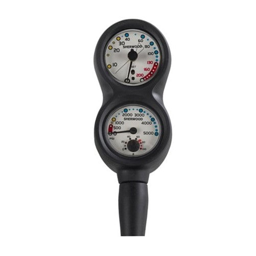 The Sherwood compact console is a low profiled and ergonomically-designed to fit-in-the-hand-comfortably, and is easy-to-read at a glance with its outstanding-graphics. The console has an air filled depth gauge with a 0 to 200' readout and maximum depth indicator. The maximum depth indicator needle which will mark your deepest depth reached on a dive. This feature is helpful when logging dive information providing key information for repetitive dives. The colored graphics allow quick-glance-monitoring with bright depth indicators at strategic positions on the gauge face. The yellow indicators are at 0' to 30'. The depth range from 35' to 120' is in blue and then from depths beyond the standard sport diving limits of 130' to 200' is in red. Gauge face is luminescent for night or low light situations. Pressure gauge has a pressure readout from 0 to 5,000 psi and features a temperature gauge. The pressure gauge like the depth gauge has high visibility graphics with bright red from 0 to 500 psi of reserve air, yellow indicators above 500 to 1,000 psi for extended reserve air for deeper dives and blue above 1,000 to 5,000 psi. Pressure gauge face is also luminescent. The temperature gauge has a bright red needle for easy reading. Pressure gauge comes with a 32" (81.3 Cm) high pressure 7/16" threaded hose. Both the depth and pressure gauges are small 1 75" (4.4 Cm) diameter and protected by a impact resistant rubber boot.