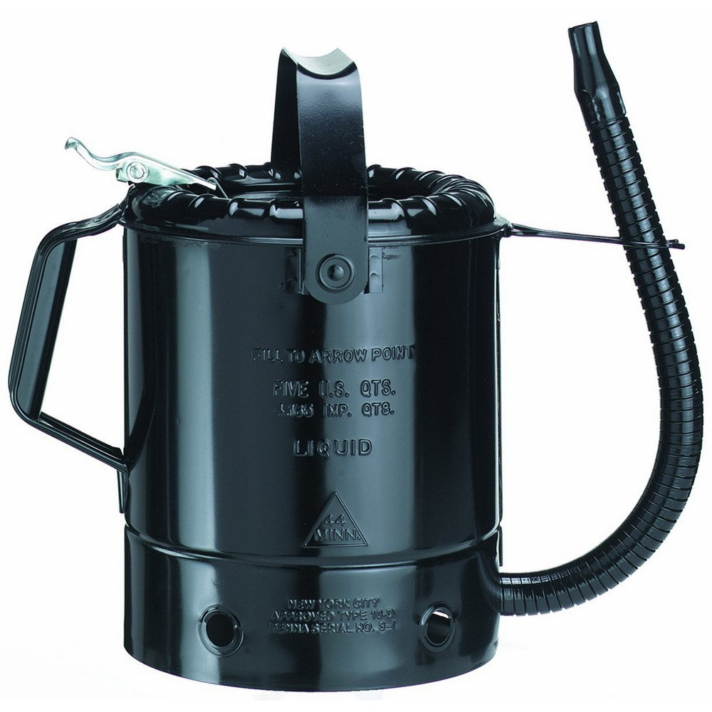 This painted measure with flexible spout is designed for one-hand operation. Thumb operated valve controls flow; flip action locks valve open. 14 inch flexible metal spout with tapered 1/2 inch OD tip swings into the necessary angle for hard-to-reach jobs. Recessed bottoms drain fully and guard against puncture. Rolled edge top helps prevent oil spillage. 5 quart capacity and 9-1/2 inch overall height.