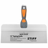Clauss 12 inch taping knife features a titanium bonded non-stick stainless steel blade for superior adhesive and rust resistance. Titanium bonded non-stick is 5x harder than untreated stainless steel and can handle your toughest tasks. Features a 5-position ergonomic comfort grip and heat treaded blade perfect for taping and large surface jobs. Strong, full tang construction and solid hammer end easily sets drywall nails. Backed by Clauss lifetime warranty. Handle design may vary from image.