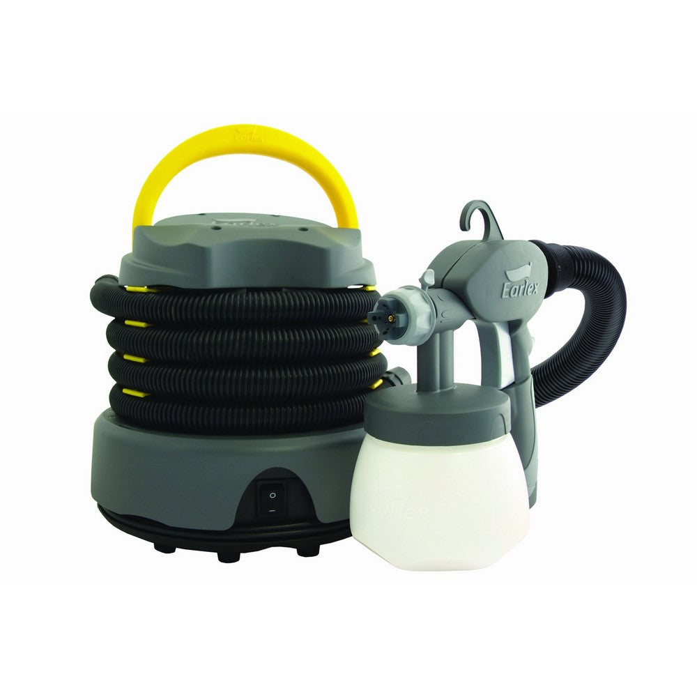 What's in the Box Earlex's lightweight expert spray gun features a three-pattern changing system and thumb control paint flow dial to ensure ease of spraying. The unit comes with a one-quart, wide-mouth paint container. An angled pick-up tube allows for overhead or downward spraying and the front loading needles make changing needles fast and cleaning easier. There is convenient on-board storage for the spray gun, 9-foot hose and 6-foot power cord. The whole experience of owning a spray station is made easy with the step by step how-to DVD included in the pack.