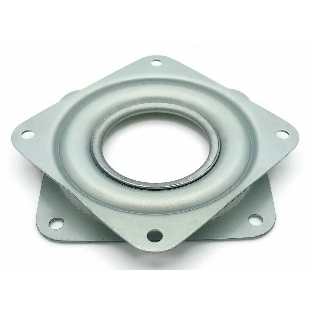 This lazy susan bearings set has two mounting plates, one for attaching to a stable surface and the other to provide a rotating turntable. The plates are 3" squares of pressed or stamped steel. They are 5/16" in thickness for strength and durability and zinc-plated for resistance to corrosion. The large 1/4" bearings allow for efficient operation and maximum stability of the mechanism, even under heavy loads. The maximum load capacity is 200 lbs. This lazy susan bearings set requires 8 screws for mounting (sold separately), and it will work with turntables up to 18" in diameter. It is suitable for use with revolving shelves in kitchen cabinets, planters, serving platters at the table, and large tabletops, among others.