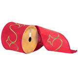 4" x 10yd Red Ribbon with Green Embroidered Vine