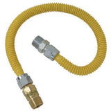 1/2" male iron pipe, tapped 3/8" female iron pipe x 1/2" male iron pipe x 48", safety Plus Advantage coated stainless steel, gas connector, 15/16-16 thread, 1/2" i.D., 5/8" O.D., tube with fittings, aga approved & ias design certified for indoor/outdoor use.