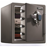 Average heat in a building fire is 1200°F, that's why our fire resistant safes are built to endure 1 hour at 1700°F and keep interior temperature below 350°F to protect your priceless documents and digital mediaWhen the fire department sprays water onto your house, water resistant safe ensures contents inside remain dry for up to 24 hoursIn a fire, floors have the potential to collapse, digital combination safe is certified to withstand impact from falls of up to 15 feet. Capacity- 1.23 cubic feet. Material - Steel-Cased Fire InsulationShould your safe be damaged by fire or water, SentrySafe will send a replacement safe so the things that matter most are protected for generations to come; US based customer service for product-related questions and lost key replacement servicesSpecifications: Digital combination lock, interior LED light, four live locking bolts, & locking drawer; Exterior dimensions: 17.8 in. H x 16.3 in. W x 19.3 in. D; Interior dimensions: 13.8 in. H x 12.6 in. W x 11.9 in. D; 86.6 lbsCertifications: UL Classified to protect your valuables in a fire for 1 hour in up to 1700°F; ETL verified water resistance in up to 8 inches of water for up to 24 hours; ETL verified to withstand a 15-foot drop during fire and stay closed