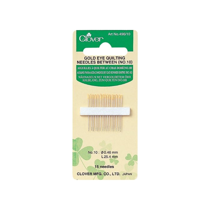 CLOVER-Gold eye quilting needles betweenAn extra fine needle for beautiful quilting stitchesMade in United States15 needles per card15/#10 0.46 x 25.4mmSharp needle pointNickel plated for smooth sewingQuality Clover sewing notion# 496/10 Gold eye quilting needles between #10. These needles will glide through fabric smoothly. The needle has gold eye plating with a unique elliptical design for easy threading. The hardness of steel was obtained through high temperature treatment and tempering making our needle hard to break or bend.