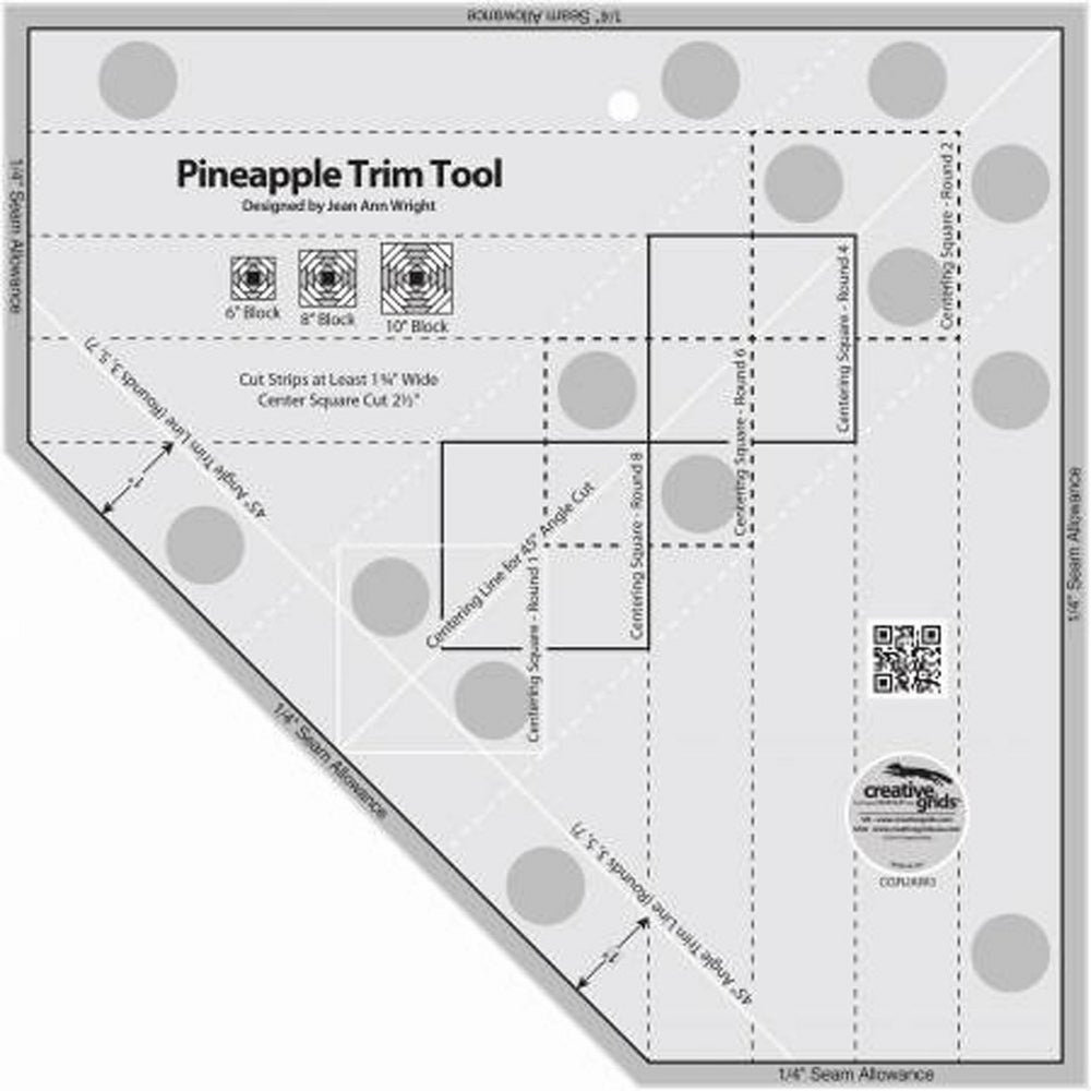 Creative Grids Pineapple Trim Tool is designed by Jean Ann Wright. Create PERFECT 6", 8" or 10" finished pineapple blocks with this ruler for quilting. Since each round of strips is squared up before the next set is added, the blocks are perfectly squared. This is a PERFECT ruler for free motion quilting which comes with EXCLUSIVE feature of embedded gripper to hold fabric to avoid slipping. Packaged Creative Grids quilting tool includes step by step instructions.