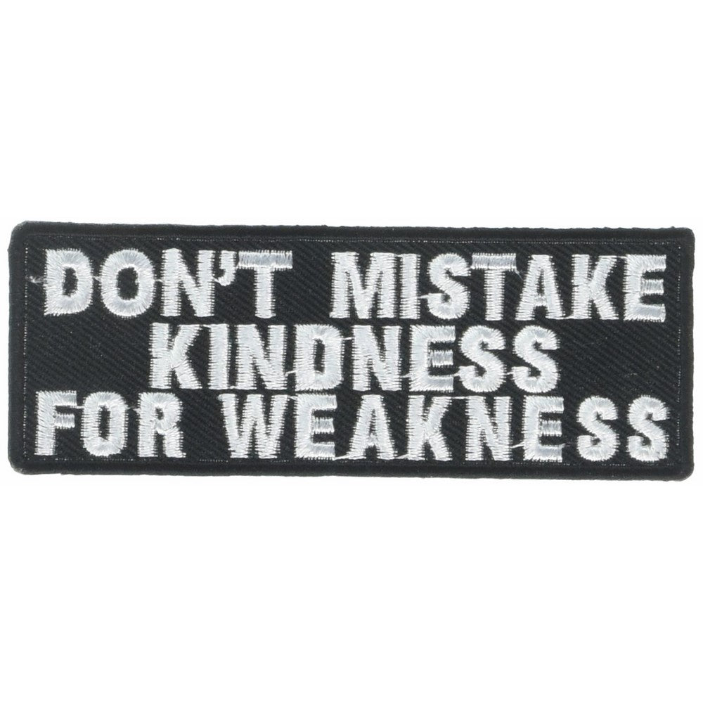 This is the awesome, fully embroidered DON'T MISTAKE KINDNESS FOR WEAKNESS Patch! This great patch measures about 4 x 1.5 Combined Shipping Suggestions ::Heygidday is delighted to offer combined shipping as much as we can! Here is how it can work, please read this carefully if you plan to purchase multiple items and you wish to save on shipping costs. Once you order and make payment we are NOT able to change the order and per the marketplace rules it needs to be shipped as ordered to the buyer. The marketplace locks the order and may also take a percentage of the shipping amount. So the best method is to buy everything you need BEFORE you pay and then only once you are finished buying, then make payment.If you are still unsure the shipping will be one low fee then BEFORE you pay, send us a message asking us to combine your order! We will then send you a final invoice and make sure the shipping is the lowest possible amount. Note we can NOT do this if you have already paid. See note above about that! The way it works is you will pay the shipping ONCE only if you follow these suggestions, and it will be the highest shipping amount of the items you have purchased and that is it.For example vest extenders are heavier than patches so shipping is a little more. But you only pay it once if you follow this method. Hip flasks we sell are a bit different, since they are made of strong stainless steel and they often weigh around half a pound each. You will pay a shipping fee for the first flask you buy and then pay a lower fee for each additional flask you buy. But we assure you we have gone through this very carefully we ONLY charge minimal shipping amounts.We do not make money on shipping (even though the marketplace may do). So the bottom line is, buy whatever you want, but message us for a total BEFORE you pay! Thank you.More Tips For Combined Shipping ::1. Avoid using the marketplace cart (we cannot see anything in your cart).2. Do NOT use a cell phone to try and c