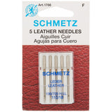 EURO NOTIONS-Schmetz: Leather Needles. This package contains five sewing machine needles designed specifically for use with leather, artificial leather, and heavy non-woven synthetic fabrics. They are all size 110/18 and have a cutting point. Imported.