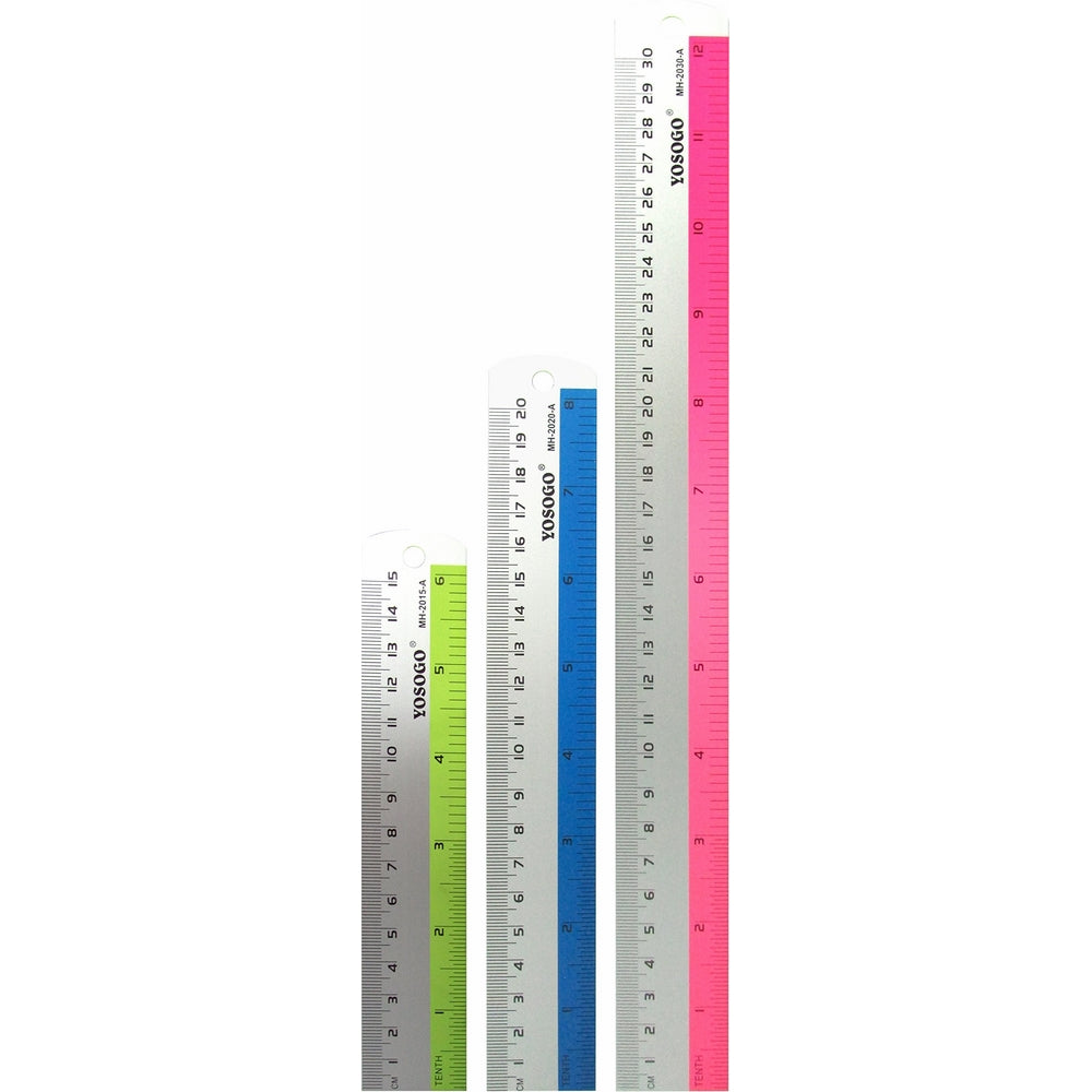 Set of 3 aluminum rulers of 6, 8, 12 inch. (15, 20, 30 cm). Width 30 mm / 1.2 inchVery durable, made from high quality anodized aluminum. Random color.Calibrated in centimeter and inchWith inch-cm conversion tableIdeal for home, school, outdoor and office
