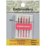 KLASSE-5 German-engineered steel embroidery machine needles. The specially coated wider eye allows the thread to pass through more freely at high speeds. The pontoon scarf reduces the chance of skipped stitches and thread breaks as the fabric is flexed up and down by the rapidly moving needle. The specially designed shaft also reduces the chance of needle breaks. Best for: machine embroidery on knit and woven fabrics. Use with rayon cotton polyester silk or acrylic embroidery thread.