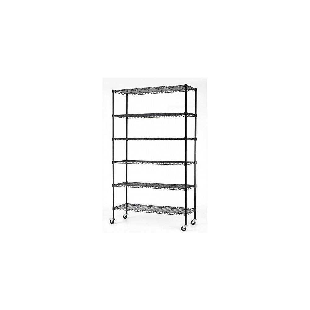 Features: Brand New Commercial 6 Shelf Adjustable Steel Wire Shelving. The weight limit per shelf is 220 LBS without wheels. 3" commercial castor wheels with two that lock for safety Height adjustable non-rolling/stationary feet included, allows shelving to hold up to 220 lbs. per unit NSF rated for food safety Shelves adjust at 1" increments Heavy Duty Steel Shelves are adjustable height at 1" increments Commercial Grade Black Wire No Tools Required for Assembly Maximum Weight Capacity for entire Unit: 1320 lbs. Maximum Weight Capacity per shelf: 220 lbs. equally distributed Maximum Weight Capacity for entire Unit when using the casters (wheels) instead of leveling feet is 220 lbs. Dimensions: 48"L x 18"W x 78"H(With stationary feet) Dimensions: 48"L x 18"W x 82"HWith Wheels)