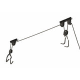 Bike-lift ceiling mount for ceilings up to 12 feet highPulley system easily hoists bikes up to 50 pounds to ceiling; secure locking mechanismSolid steel construction, nylon rope; no assembly requiredIncludes rack, pulley system, mounting system, hardware, rope3.8 pounds; Ratio of item weight to lifting weight is 4:1