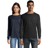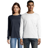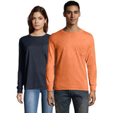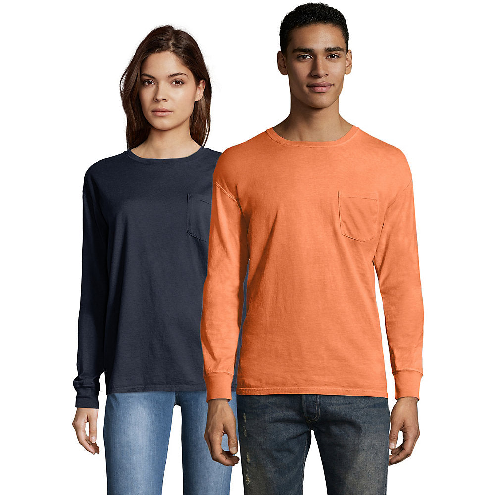 Part of the new Hanes ComfortWashtrade Collection this vintage washed garment dyed long sleeve pocket tee feels as good as it looks. 5. 5-oz. 100% ring spun cotton tee is super soft and comfortable. Vintage washed and garment dyed for a retro look andfeel. No shrink comfort for a dependable fit wash after wash. Double-needle cover-seamed neck with lay flat collar that keeps its shape. Ribbed set-in collar and cuffs. Twill label and neck tape. Shoulder-to-shoulder tape for durability. Double