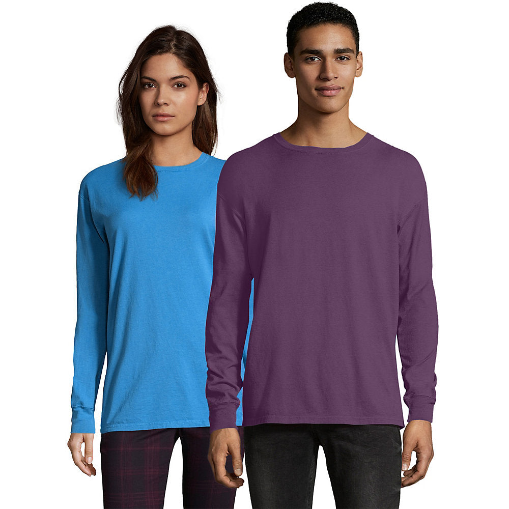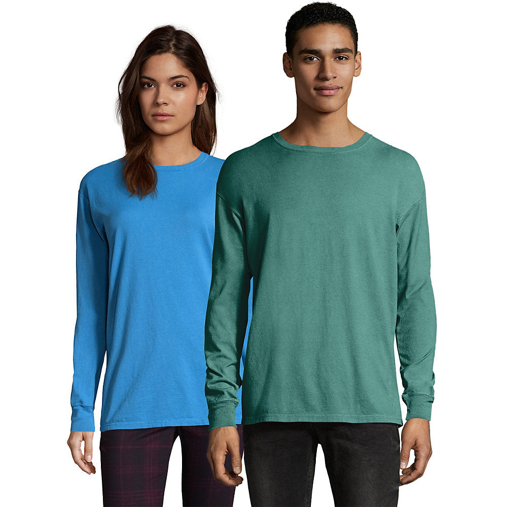 Part of the new Hanes ComfortWashtrade Collection this vintage washed garment dyed long sleeve tee feels as good as it looks. 5. 5-oz. 100% ring spun cotton tee is super soft and comfortable. Vintage washed and garment dyed for a retro look and fe el.No shrink comfort for a dependable fit wash after wash. Double-needle cover-seamed neck with lay flat collar that keeps its shape. Ribbed set-in collar and cuffs. Twill label and neck tape. Shoulder-to-shoulder tape for durability. Double-needle bottomhem. Sewn in label. Available in a variety of colors. Cotton sourced from American farms.