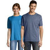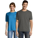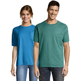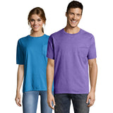 Part of the new Hanes ComfortWashtrade Collection this vintage washed garment dyed pocket tee feels as good as it looks. 5. 5-oz. 100% ring spun cotton tee is super soft and comfortable. Vintage washed and garment dyed for a retro look and feel. N o shrink comfort for a dependable fit wash after wash. Double-needle cover-seamed neck with lay flat collar that keeps its shape. Ribbed set-in collar. Twill label and neck tape. Shoulder-to-shoulder tape for durability. Double-needle sleeve and bot tom hems. Sewn in label. Available in a variety of colors. Cotton sourced from American farms.