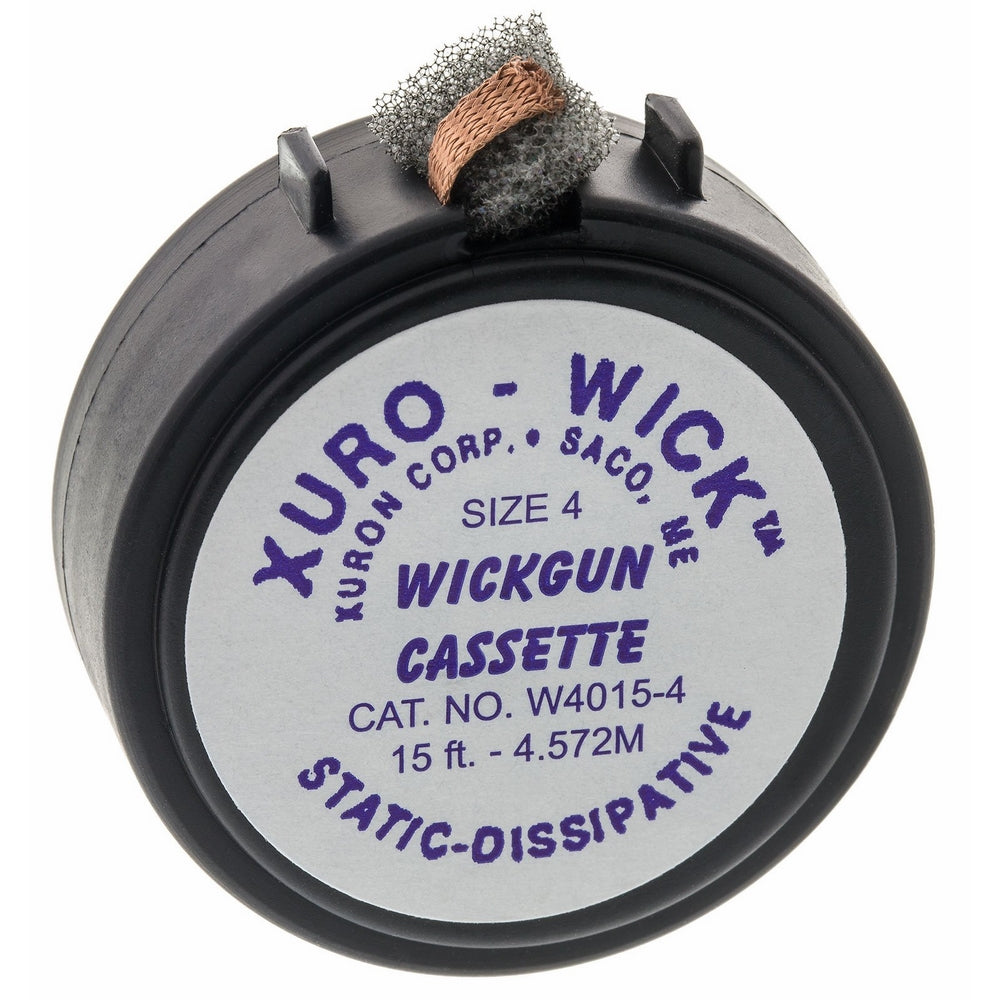 Wickgun Cassette - Size 4 Desoldering Braid. Wickgun desoldering braid dispensers combine the capabilities of desoldering braid with the convenience of a hand tool. Simple, one handed operation dispenses, positions and cuts off braid, even the smaller, hard to control sizes. The only other tool you need is your soldering iron. Wickgun braid dispensers fit comfortably in your hand; rotate the thumb wheel to advance or retract the braid, squeeze the trigger to cut off the used braid. There are no plungers to push, spring loaded levers to cock or vacuum chambers to empty. You never touch the braid. You don't burn your fingers. You stay clean and solderability is enhanced since the desoldering braid is not contaminated by finger oil or other foreign matter.