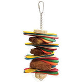 Tough coconut husk slices and colorful soft wood slats provide hours of foraging fun and play steel hardware keeps the stack steady chain runs through the center and is hung on cage with included pear link.