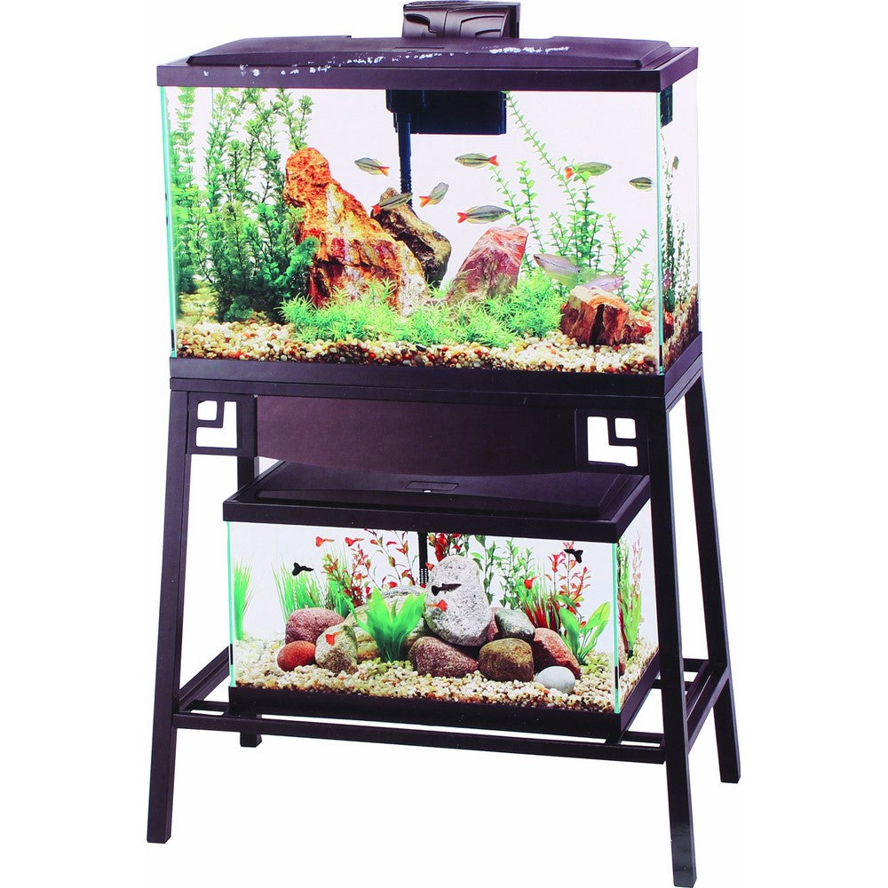 • Aqueon Forge aquarium stands offer the flexibility that hobbyists desire. Reversible wood panels allow you to choose your color: black or light brown. Each aquarium stand is equipped with a bottom shelf that can be utilized for a second tank or to showcase home décor. The center wood panel flips upward for easy access to the bottom shelf. Steel construction provides great durability and features a rust-resistant powder-coated finish.