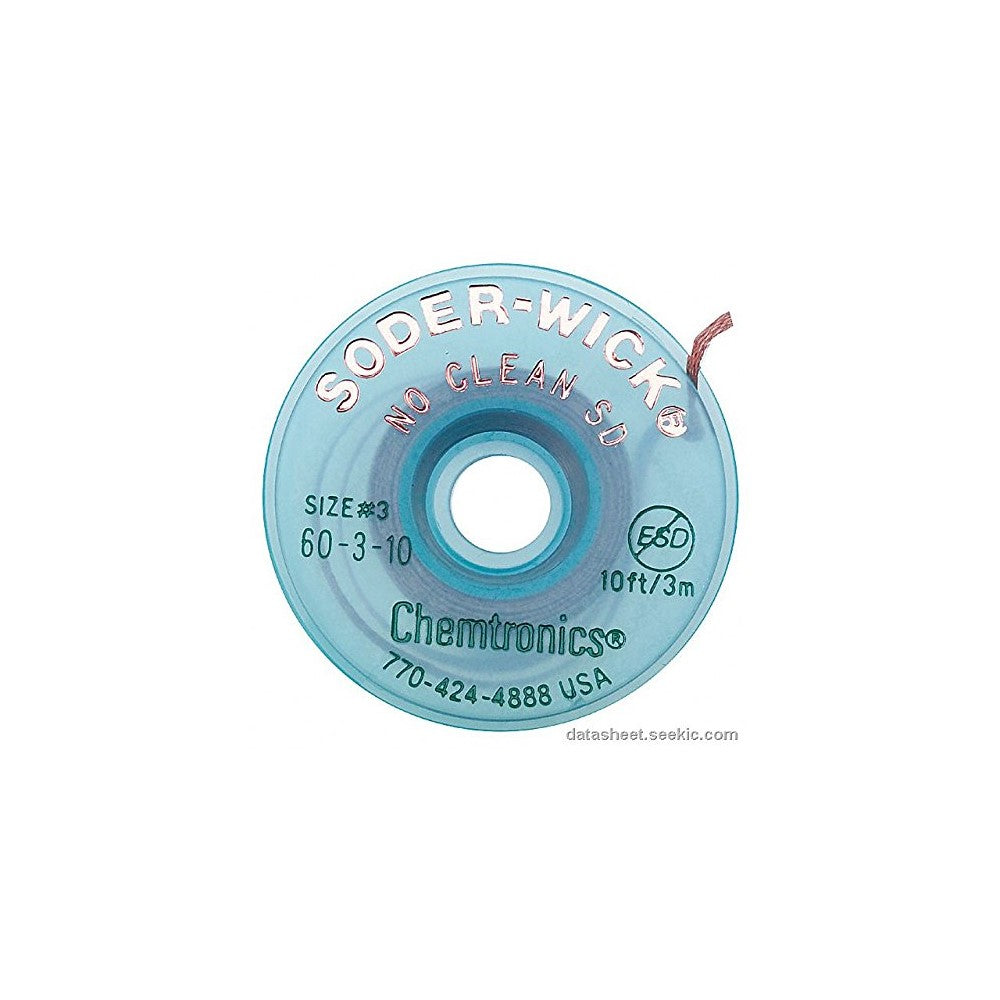 The Chemtronics 60-3-10 is a safe no-clean flux desoldering braid for removing solder from printed circuit boards that is packaged in static dissipative bobbins.