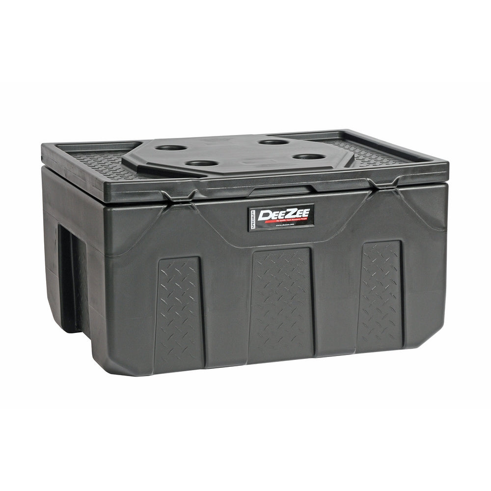 Rigid Poly Plastic Frame Resists WarpingDouble Wall Lid For Extra SupportCup Holders Molding Into LidMolded Locking Tabs For Security (Padlock Not Included)L: 39" x W: 27" x H: 17" And Vol: 10.4 cu. ft.Dee Zee Tool Box - Plastic poly utility chest. Constructed of strong yet lightweight plastic. Built to add quick storage wherever you need it. Truck, trailer, boat, dorm room, garage, barn, workshop or anywhere else you can use storage. Molded cup holders on lid provide convenience. Foam gasket around lid helps makes box weather resistant. Built in locations on lid accept your pad lock for security (pad locks not included).
