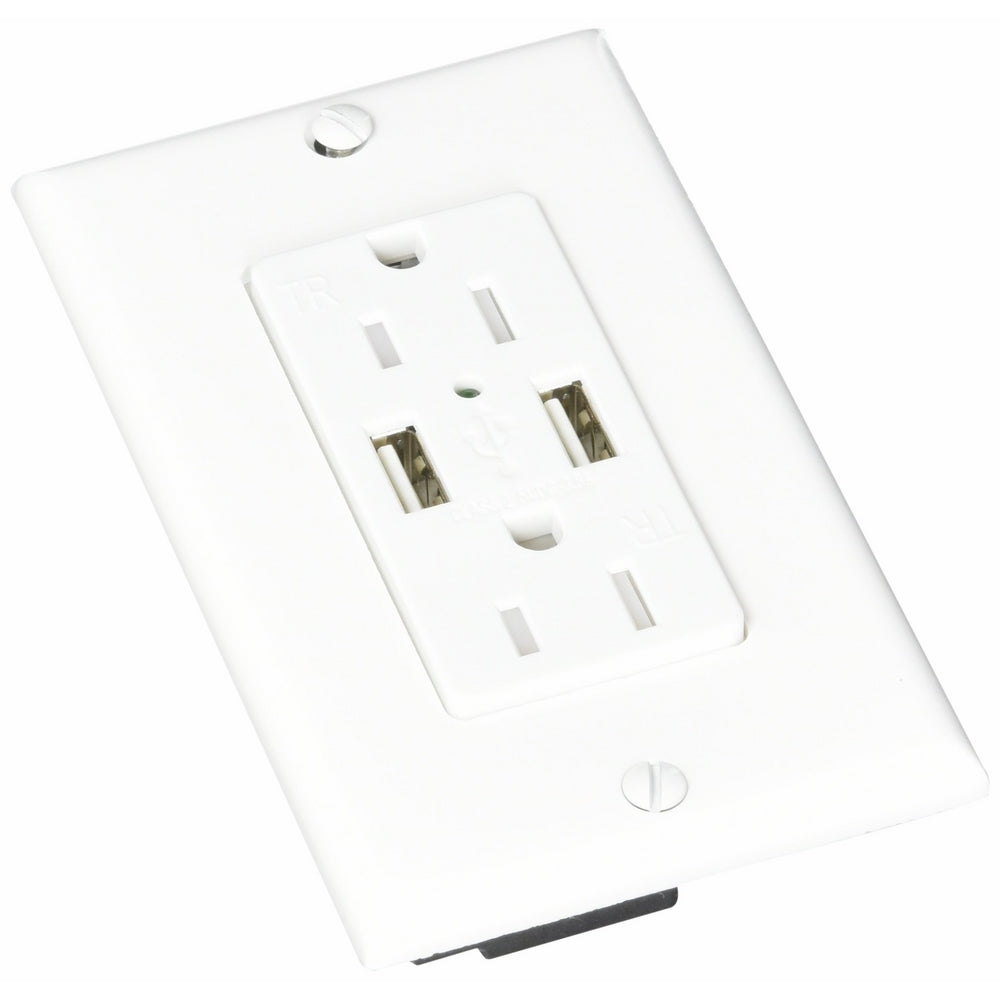 • This white dual USB charger and duplex receptacle provides both USB and electrical power in a standard single-gang electrical opening. Designed to provide more charging options for personal electronics, the USB ports are capable of charging two tablets or phones simultaneously. The dual USB charger duplex receptacle includes 2 3A/5V USB ports and 2 Hubbell tamper resistant 15A/125VAC or 20A/125VAC power outlets which can be used simultaneously.