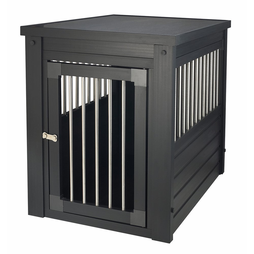 The ecoFLEX Habitat 'n Home InnPlace Pet Crate with Metal Spindles is the perfect crate for your pet while they are indoors. This stylish crate can pull double duty as an end table too. Made of durable non-toxic materials that is maintenance free as it will not crack, warp, absorb moisture and is easy to clean. Available in Russet, Espresso and Antique White. This easy to assemble crate is available in four sizes to accommodate all dog sizes. Double latches on large and XL models. 10 yr. Manufacturer's Warranty.