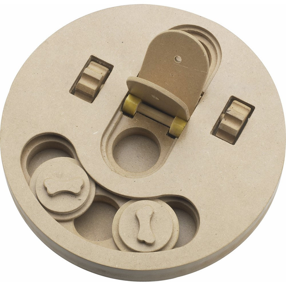 The bone shaped board has ten holes for hiding treats. Six sliding disks challenge the dog to find the treats in the right holes.