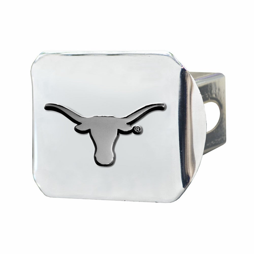 • FANMATS University of Texas Hitch Cover fits all 2 inches/type III hitches. Keep your hitch clear of debris and let everyone see your favorite team. Easy on and off - it attaches safely and securely without tools. The hitch cover is made of durable, high quality chrome to withstand the elements no matter how the weather is. Your team's logo will be proudly displayed in a high shine, matching chrome metal. Customize your ride and let everyone know that you're the number one fan of the number one team.