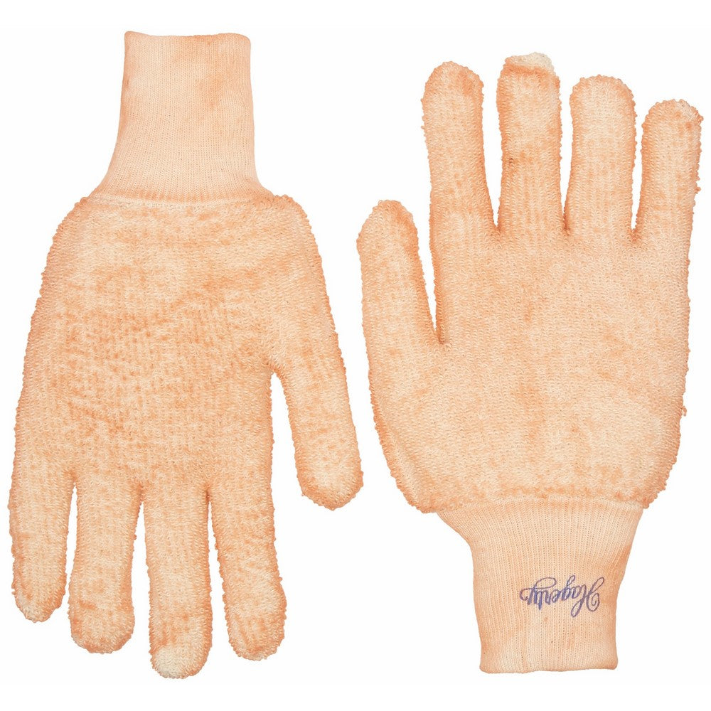 Silversmiths' gloves prevent tarnish with R-22 tarnish preventative. The effortless method that keeps silver shining brightly and tarnish free. Simply wipe light tarnish away with these specially treated gloves, made of durable, heavy-gauge terry cloth. Your hands stay unsoiled while the gloves replenish your silver and other fine metals' patina and help prevent tarnish. Even safe for use on 24 karat gold. They will remove tarnish and at the same time affix a tarnish-proof barrier on your silver. If the tarnish streaks while using the gloves, you may wash them. Do not use a fabric softener when washing the gloves. Use Hagerty Dry Silver Polish to recondition the Silversmiths' Gloves.