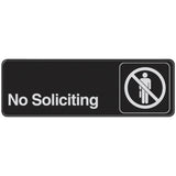 - No Soliciting Visual Impact Sign informs visitors that solicitation is not allowed in the premise. The sign helps minimize interruptions. Hillman No Soliciting Visual Impact Self-Adhesive Sign has No Solicitation text in bold white, and a crossed person figure in bright white against a reflective black background.- Sign made of ultra-violet fluorescent ink for maximum visibility from a distance. The acrylic finish has a slightly glossy surface. This helps give the sign a professional visual impact, while also giving it a bright and bold appearance. Measures 3 x 9 inches.- Made using high-grade injection-molded plastic material. The molded material has enhanced strength, is extremely durable and tear resistant. Withstands most environments, and will not fade in extreme temperatures.- Self-adhesive backing for easy installation. Sticks effortlessly to most smooth, flat surfaces.- Made in USA. This item is sold individually as a single pack, 1-Sign.