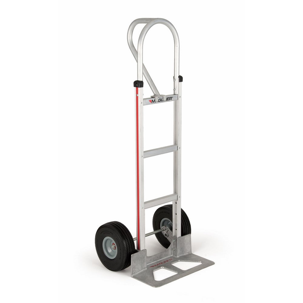 • The Magliner HMK15AUAC aluminum hand truck has a straight back frame, vertical loop handle, diecast aluminum nose plate, 10" microcellular foam wheels and a 500 lb. load capacity. The hand truck's frame and nose plate are made of aluminum, which weighs less than steel and is resistant to rust and corrosion. The wheels on the hand truck have semi-precision bearings to help reduce friction and support the load. This hand truck requires assembly; instructions and hardware for assembly are included, tools for assembly are sold separately. Hand trucks, also known as two-wheeled dollies, are used to transport heavy or bulky items, especially in commercial product distribution and delivery. Hand trucks are L-shaped, with handles at the top, two wheels at the bottom and a small platform that touches the ground when the truck is upright. A load is placed on the platform and the truck is tilted back, balancing the weight over the wheels. Powered hand trucks have a platform that lifts the load up, or lowers it down, to reduce human labor. Some hand trucks may be convertible to platform trucks for moving large or cumbersome loads. Others fold flat for storage. Magline manufactures Magliner brand hand trucks, dollies, ramps and other products for material handling applications.