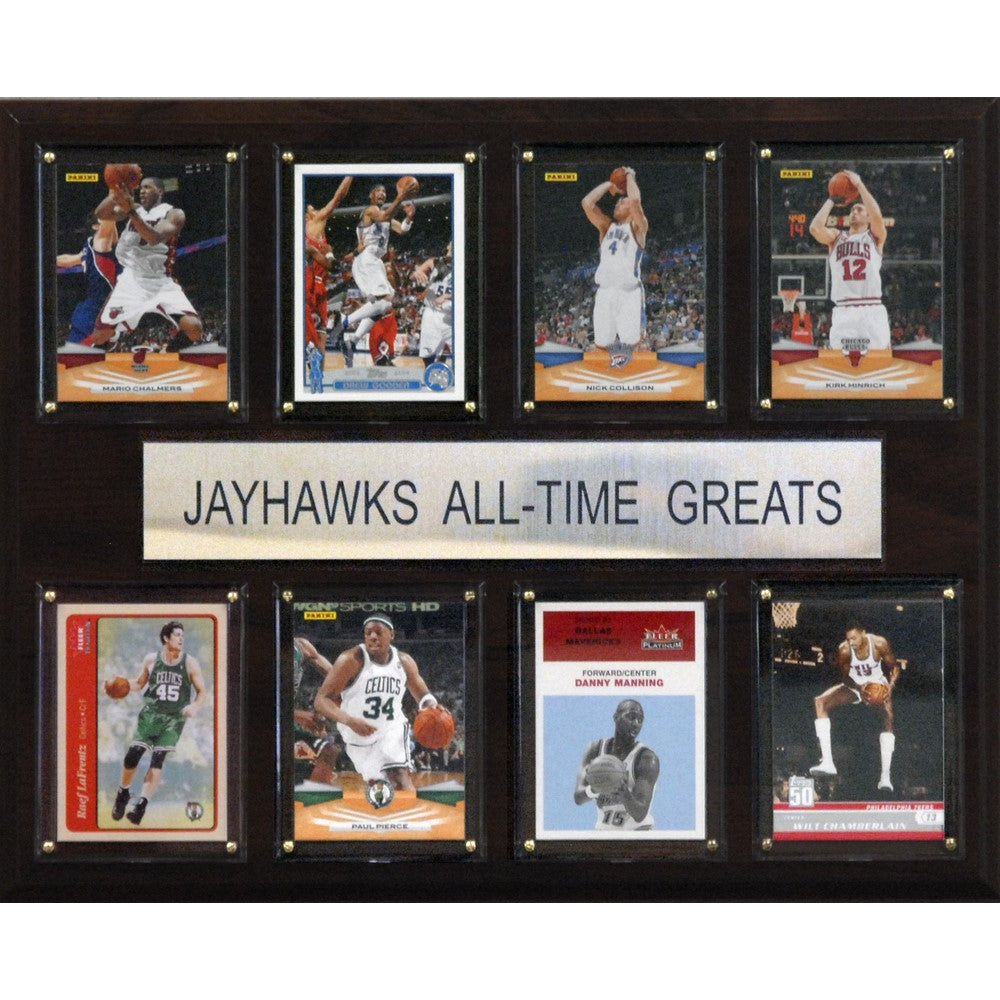 Kansas Jayhawks All-Time Great PlayersEight Licensed, Original Trading Cards12" X 15" cherry wood plaqueFull lens covers to protect cards, picturesPerfect for displaying in an office, rec room or bedroom